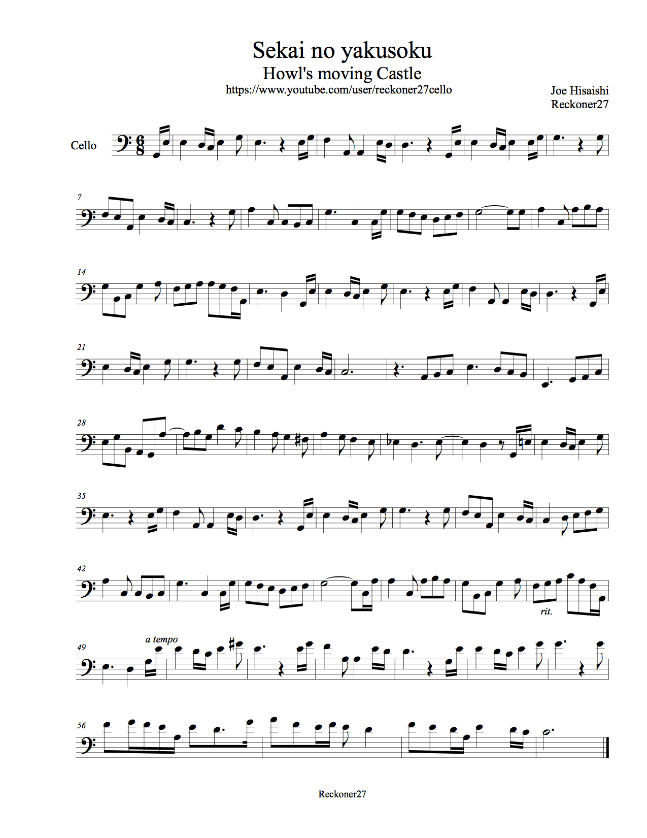 Sekai no yakusoku Cello Howl's moving castle sheet music Sheethost