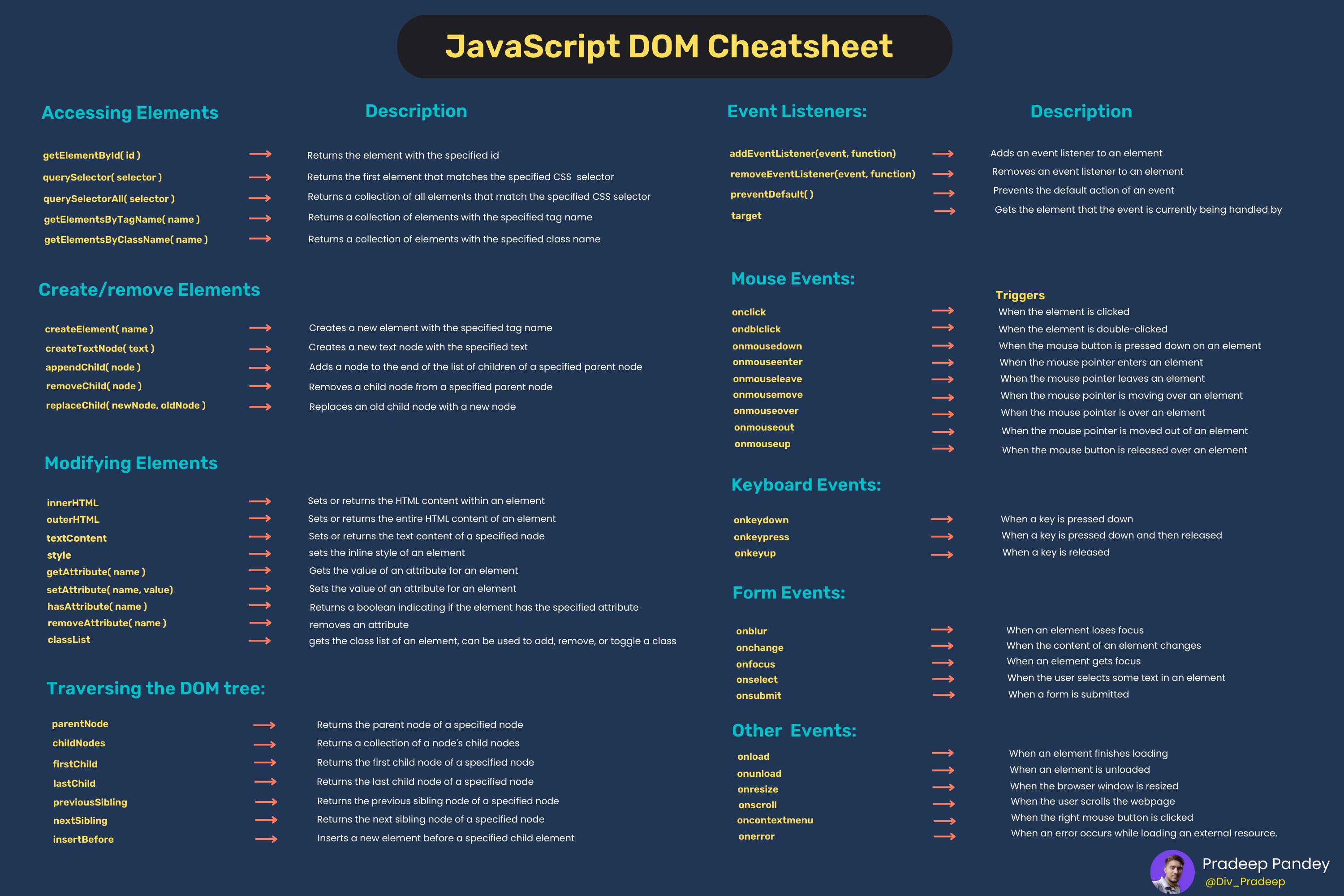 Javascript Dom Cheat Sheet - Web document object model (dom) the document object model ( dom) connects web pages to scripts or. Web this article provides a comprehensive cheat sheet for modern javascript dom, covering a wide range of.