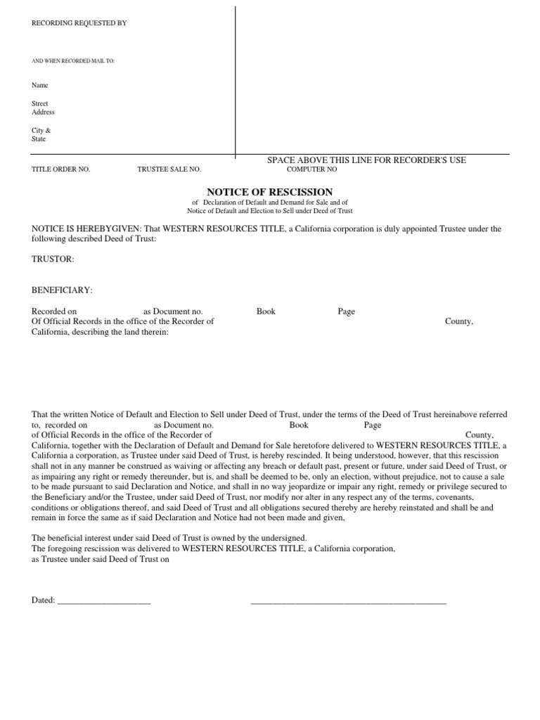 Notice of Rescission Deed Of Trust (Real Estate) Deed
