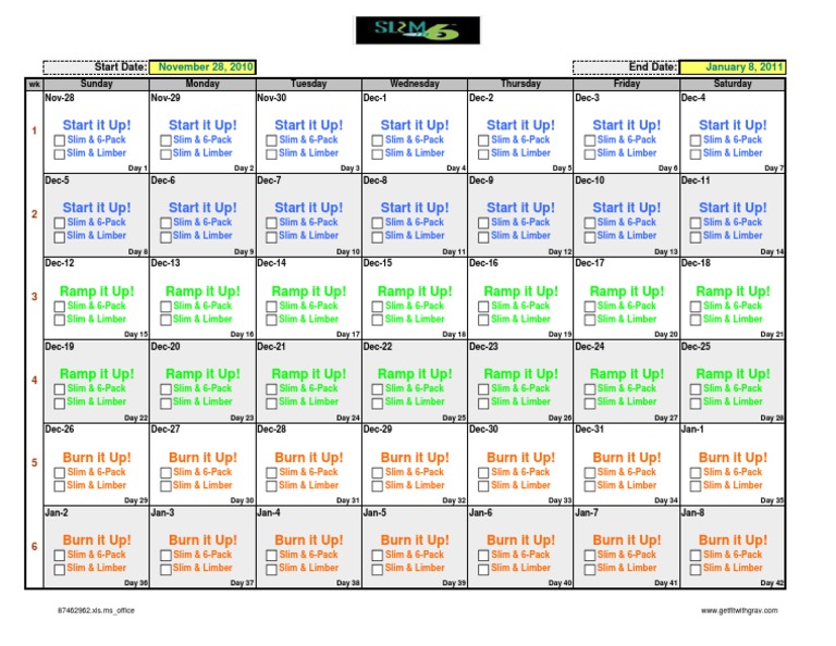 Slim In 6 Calendar - Debbie seiber’s designed the program to be easy to follow and to tone your body without bulking up. 12k views 14 years ago. Just follow the plan every day and it. Use slim series for the ultimate slim. Slim in 6 workout calendar. Each routine will tone lean muscle, shed fat and burn calories. The slim in 6 schedule is broken up into a 6 week. Welcome to the print a slim in 6 workout calendar page! Each week has 3 days of ramp it up and 3 days of burn it up. Click here for blank calendars.