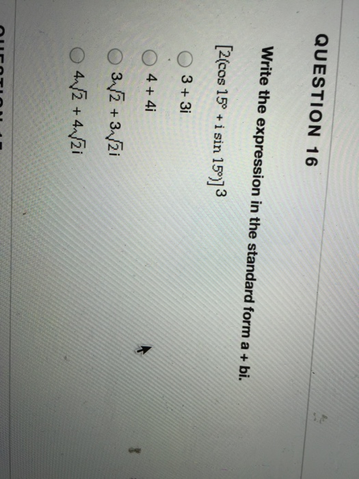 Write the expression in the standard form a +bi. Type your answer in the form a + bi.) this problem. What is a complex number? Precalculus complex numbers in trigonometric form complex number plane 1 answer.